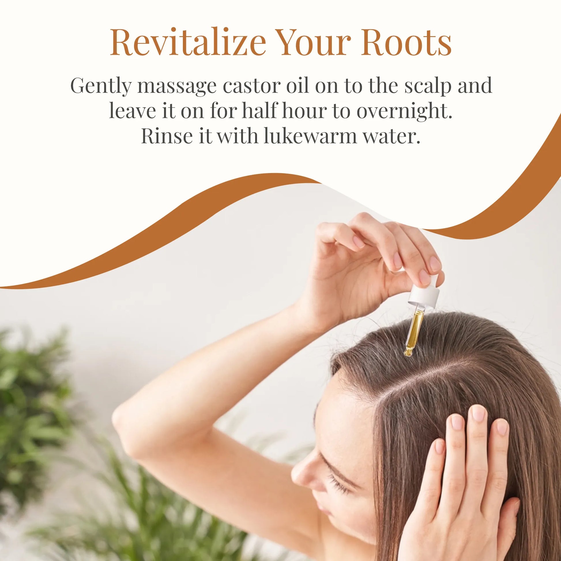 - Hair: Massage the pure castor oil into the scalp and hair to stimulate hair growth and add shine.