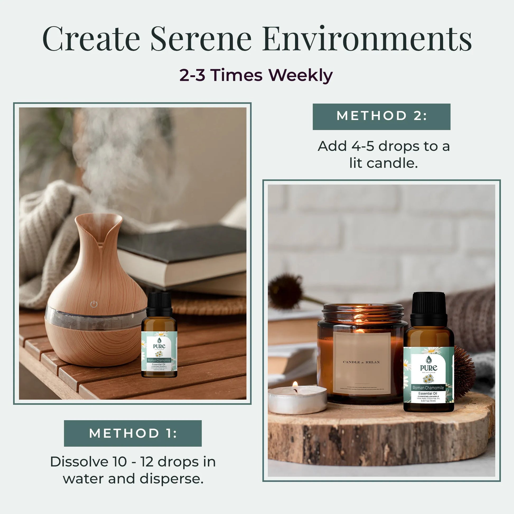 - Safe Inhalation:When using a diffuser, add only 3-5 drops to avoid overpowering effects. Diffusing for 15-30 minutes at a time is generally safe.You can also add Roman Chamomile Essential Oil to a bowl of hot water for steam inhalation, but keep your eyes away from the steam.