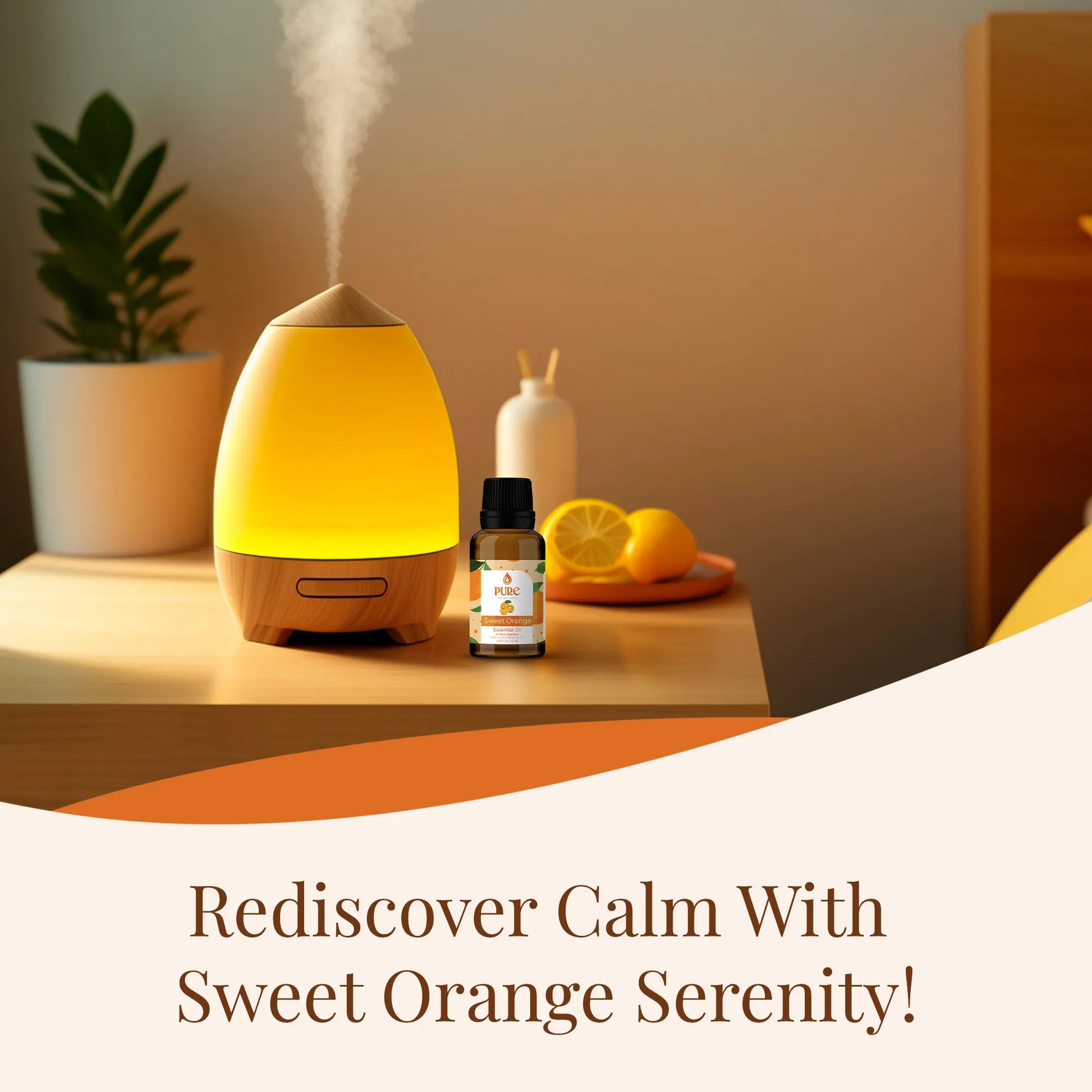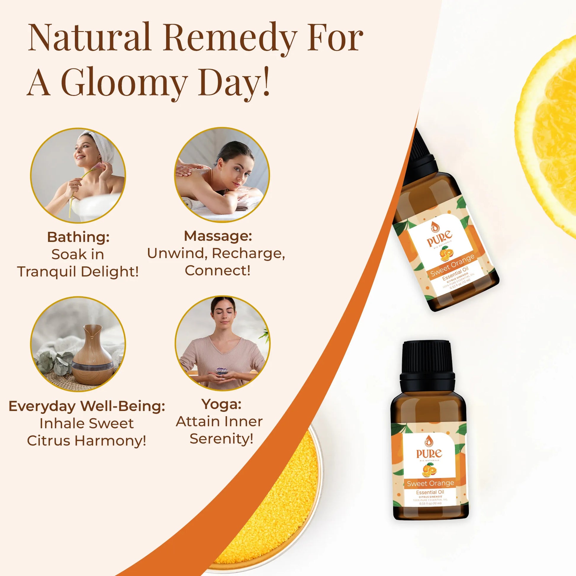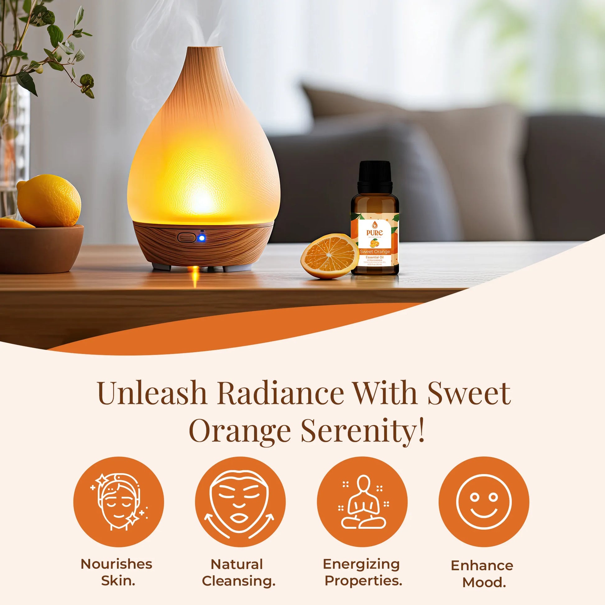 Simply add a few drops of orange aromatherapy oil to your diffuser to enjoy the benefits of orange oil aromatherapy. The uplifting scent of orange essence oil will create a calming and positive environment.