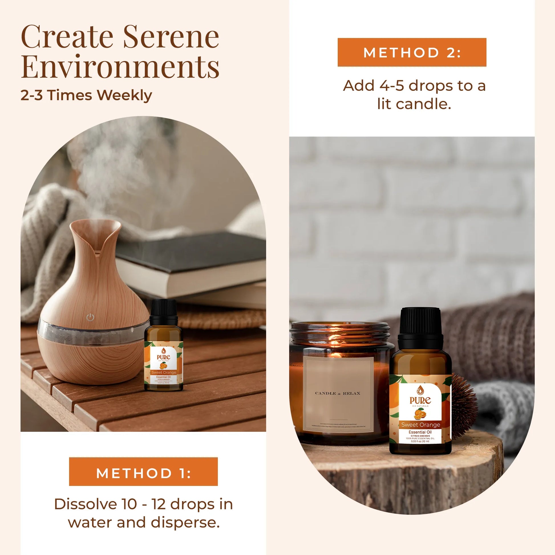 - Add a few drops of the orange essential oil into your diffuser and fill your space with this refreshing and uplifting smell.